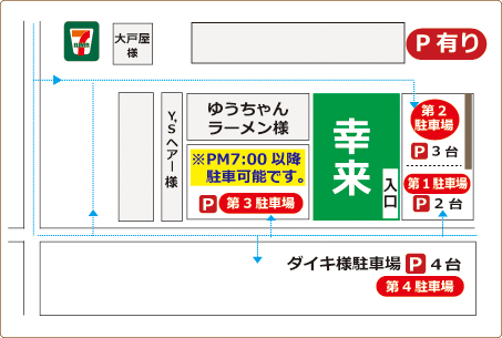 店舗隣りに5台、向かい側のダイキ様に4台、夜7時以降はお隣のゆうちゃんラーメン様前に3~4台確保しています。