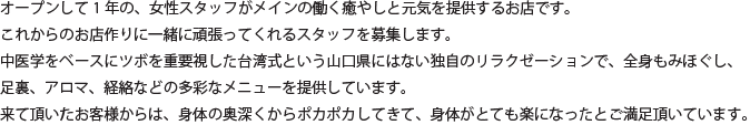 入店後。まずは10日間程度(個人差があります)の無料トレーニングを行い、中医学の基礎知識、揉みほぐしの技術を身に付けていただきます。